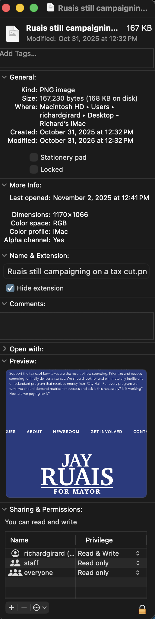 “Tell Jay Ruais it’s not ok to break promises then make them again make them again as if nobody was looking. Send him the message that you meant it when you voted to ‘prioritize and reduce spending to finally (get) a tax cut. Write in Rich Girard for Mayor!”